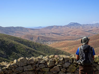 Ebenso großartig ist der Blick auf das kleine Örtchen Pajara mit seinen weiß getünchten Häusern. Schritt für Schritt erreichen wir unseren höchsten Punkt am Chuchillo de Esquen. Das mächtige Trachyt-Gestein des Risco Blanco und des Risco Carnicero türmen sich vor uns auf. Hier bekommt man eine traumhafte Rundumsicht auf die Berge und Täler der Umgebung. Ein Staudamm, Vega de Rio Palmas und selbst die alte Hauptstadt Betancuria liegen zu unseren Füßen.